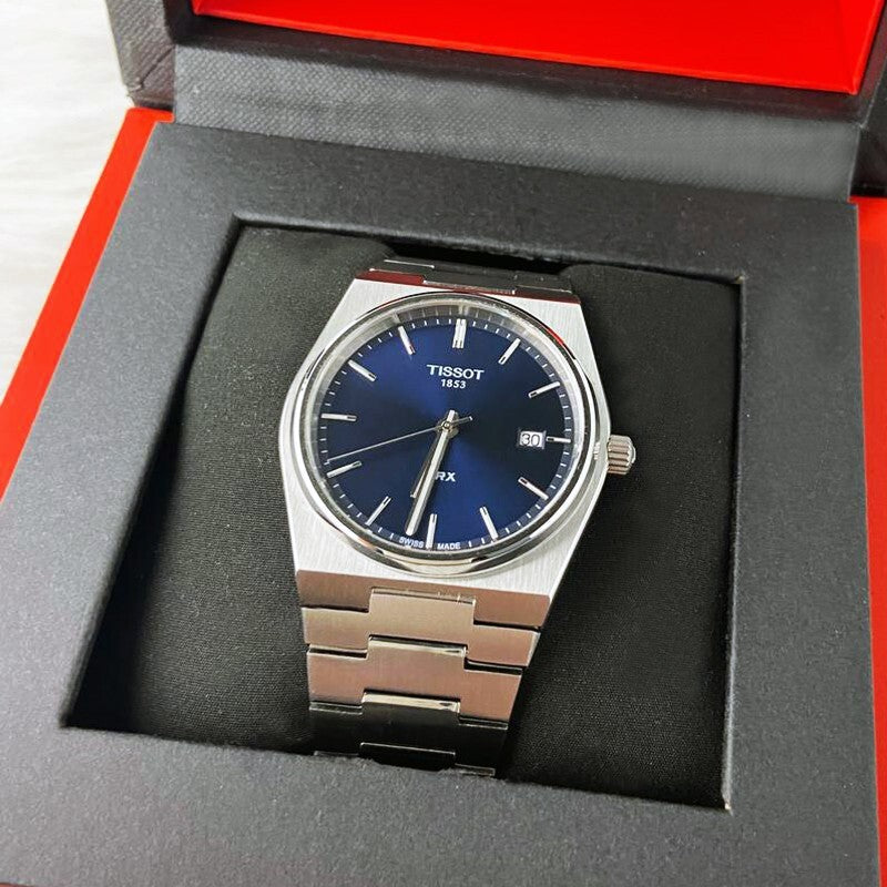 Relógio masculino que combina o design retrô da década de 70 com a engenharia suíça contemporânea. Este modelo da linha PRX destaca-se pelo seu mostrador azul profundo com acabamento "sunray" e pela caixa integrada que flui perfeitamente para a pulseira, criando uma silhueta ergonômica e sofisticada que se tornou um novo clássico da relojoaria.